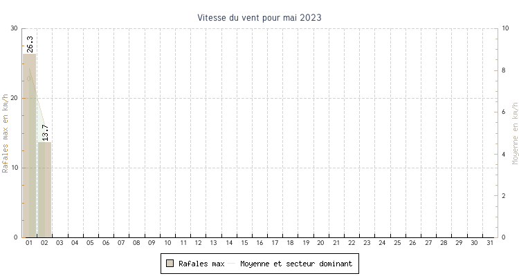 | 01 | 12.0 °C à 23:49 | 18.4 °C à 14:58 | 15.2 °C | 8.1 km/h (26.3 km/h) | 0 |